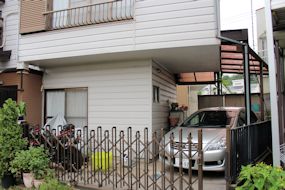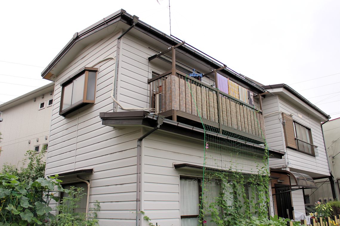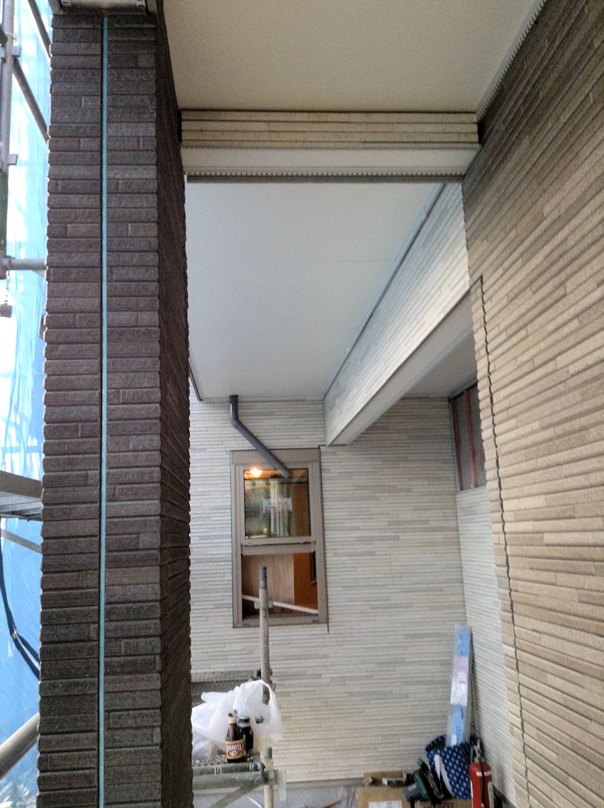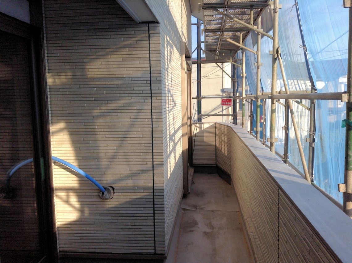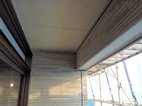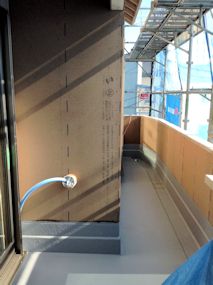 | バルコニーにもサイディングが貼られました。 | バルコニー上部は太陽光発電用に屋根を大きくしま したので、ちょうど洗濯干しの上に庇ができました。 |