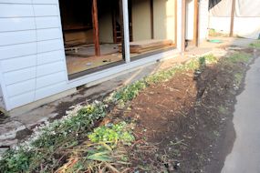 正面の玄関横は家庭菜園ように土を残しました。 このままでは壁が汚れますので手を入れる予定。 |