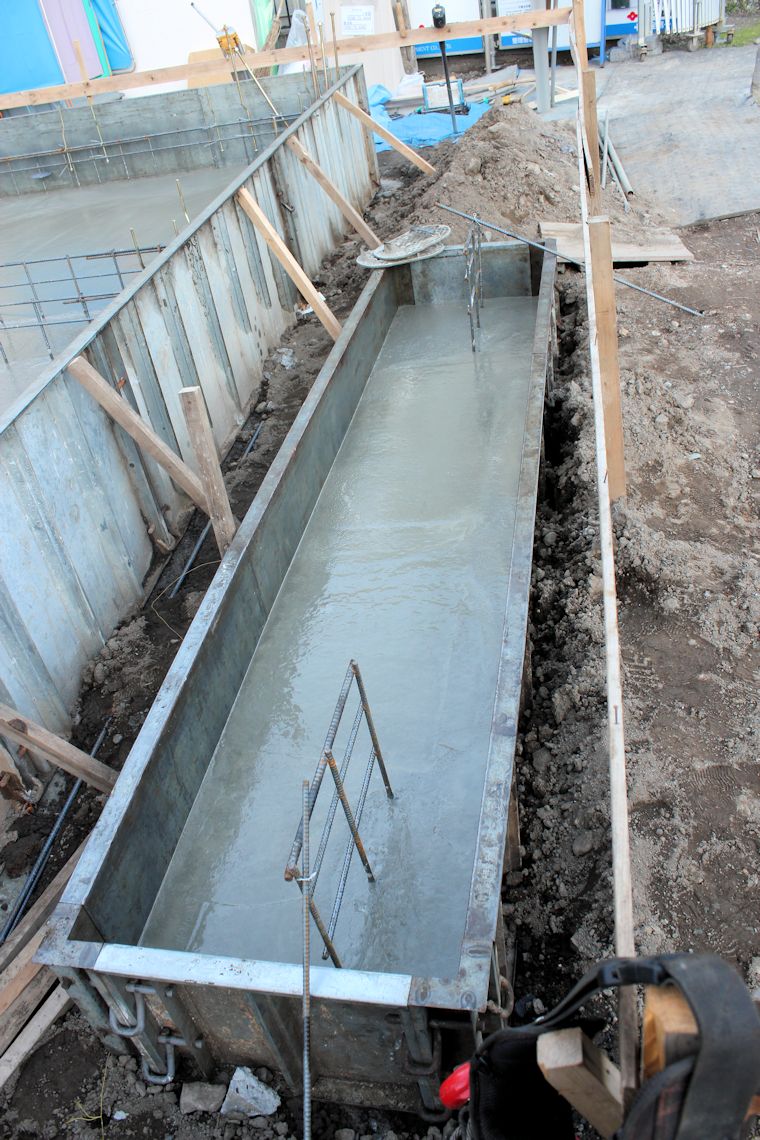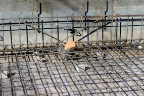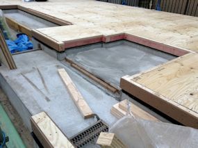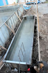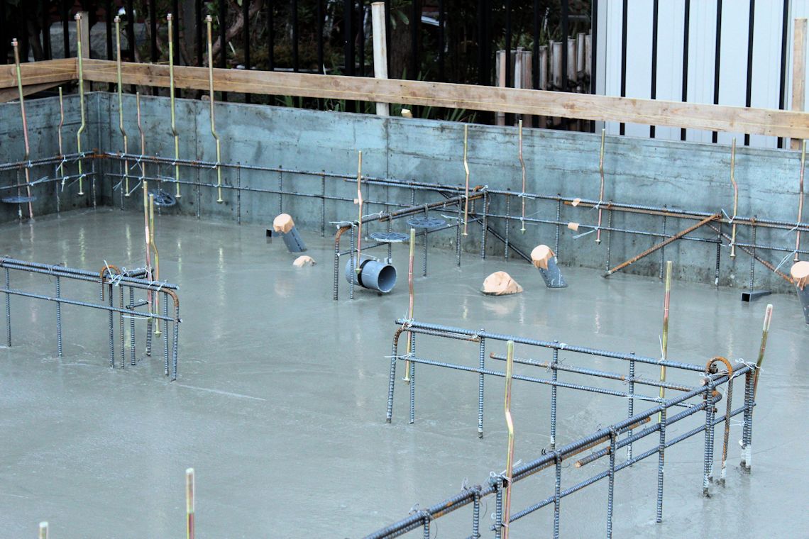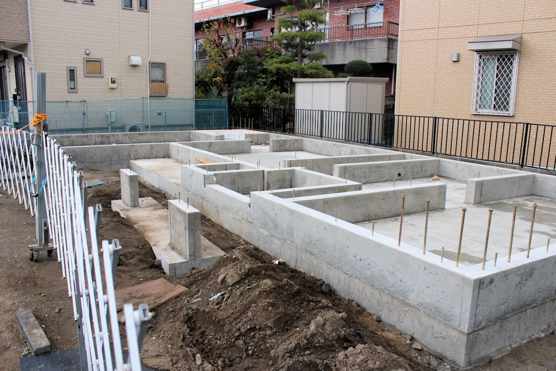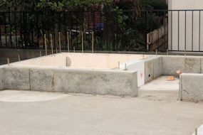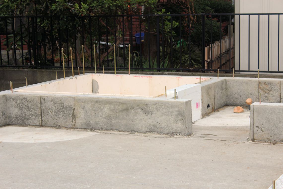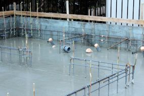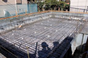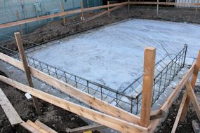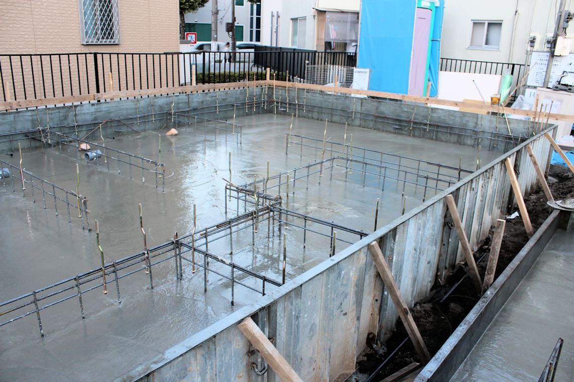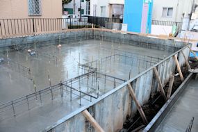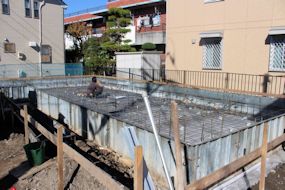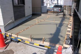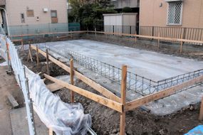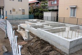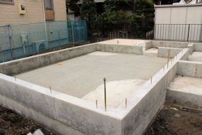 | 午前中に組み上がった鉄筋の上に、コンクリートが流し込まれました。水回りの排水パイプの頭がでています。 玄関前の柱の部分にもコンクリートが流し込まれています。 |
