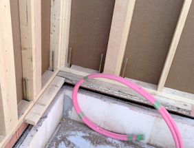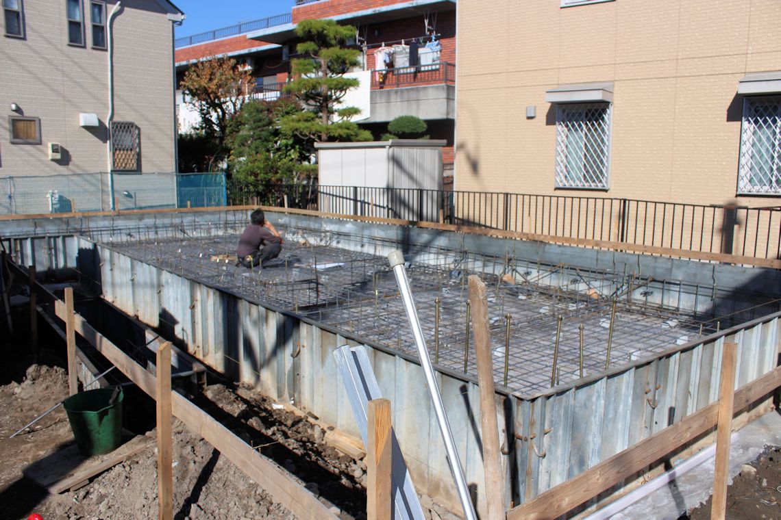| 基礎のコンクリートを流し込む前の、鉄筋を組立てた状態です。場所により鉄筋の量が微妙に調整されているのがわかります。 水回りの排水用のパイプも設置されています。 |