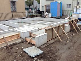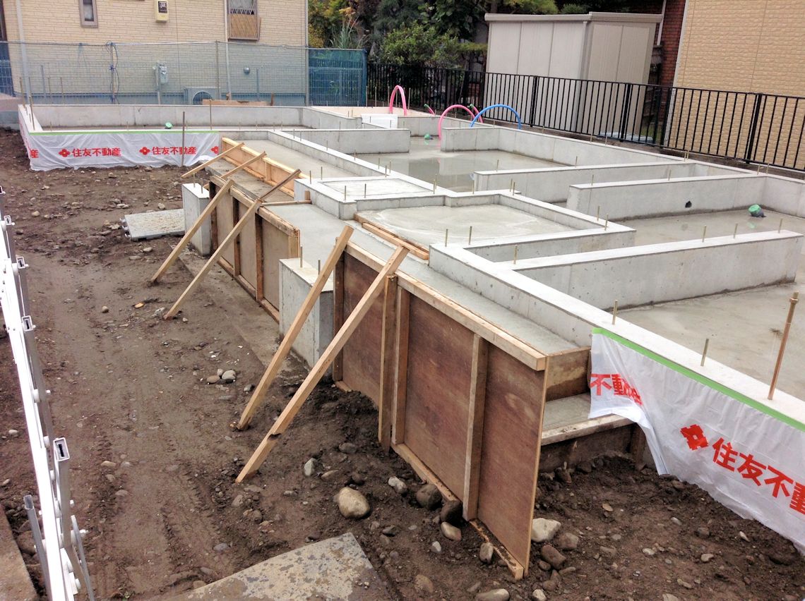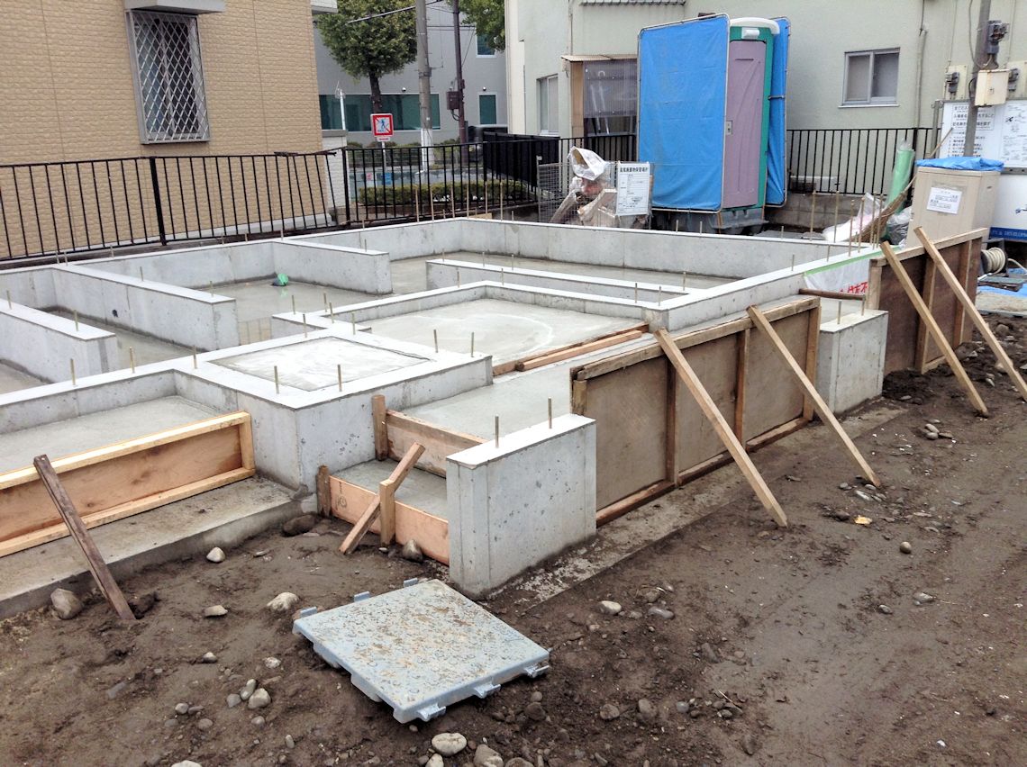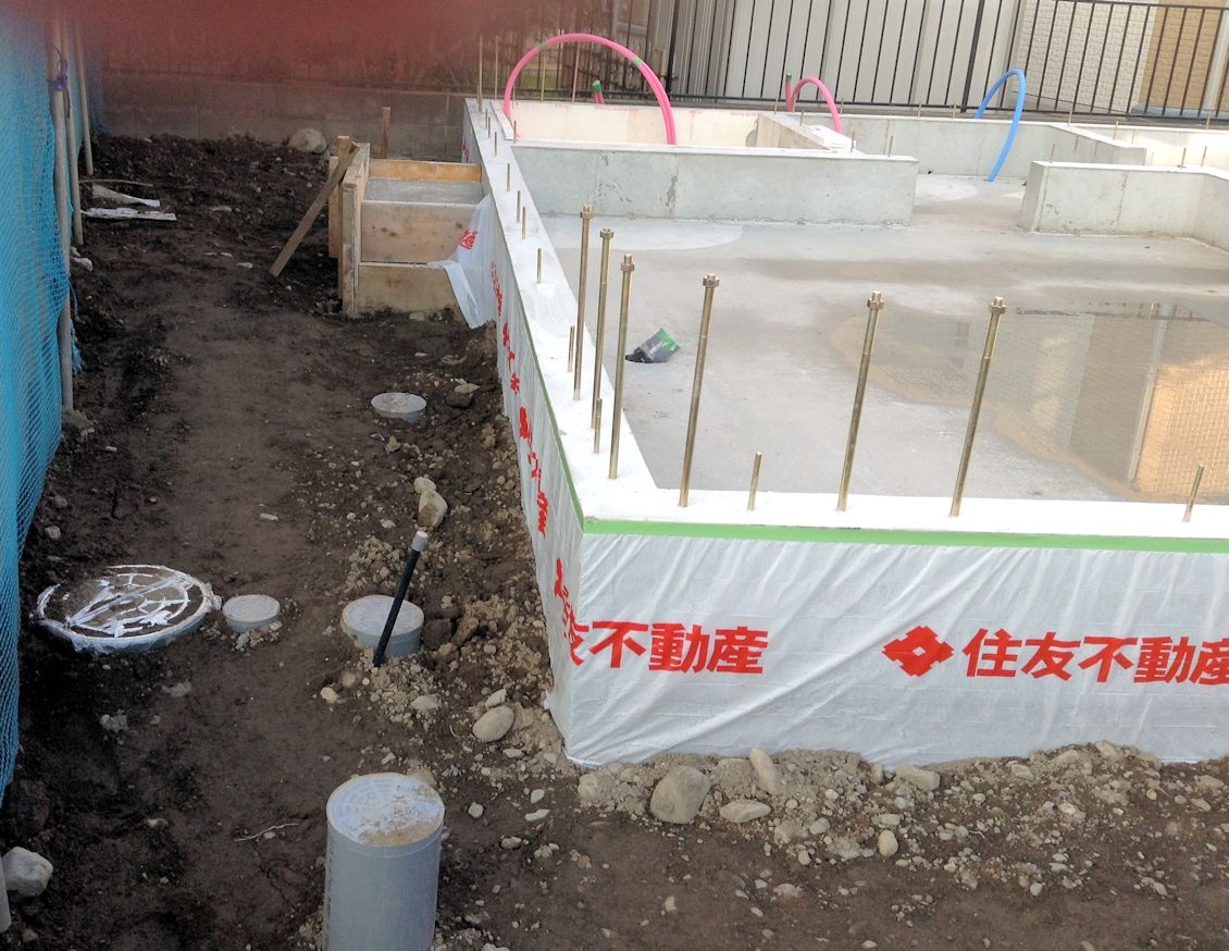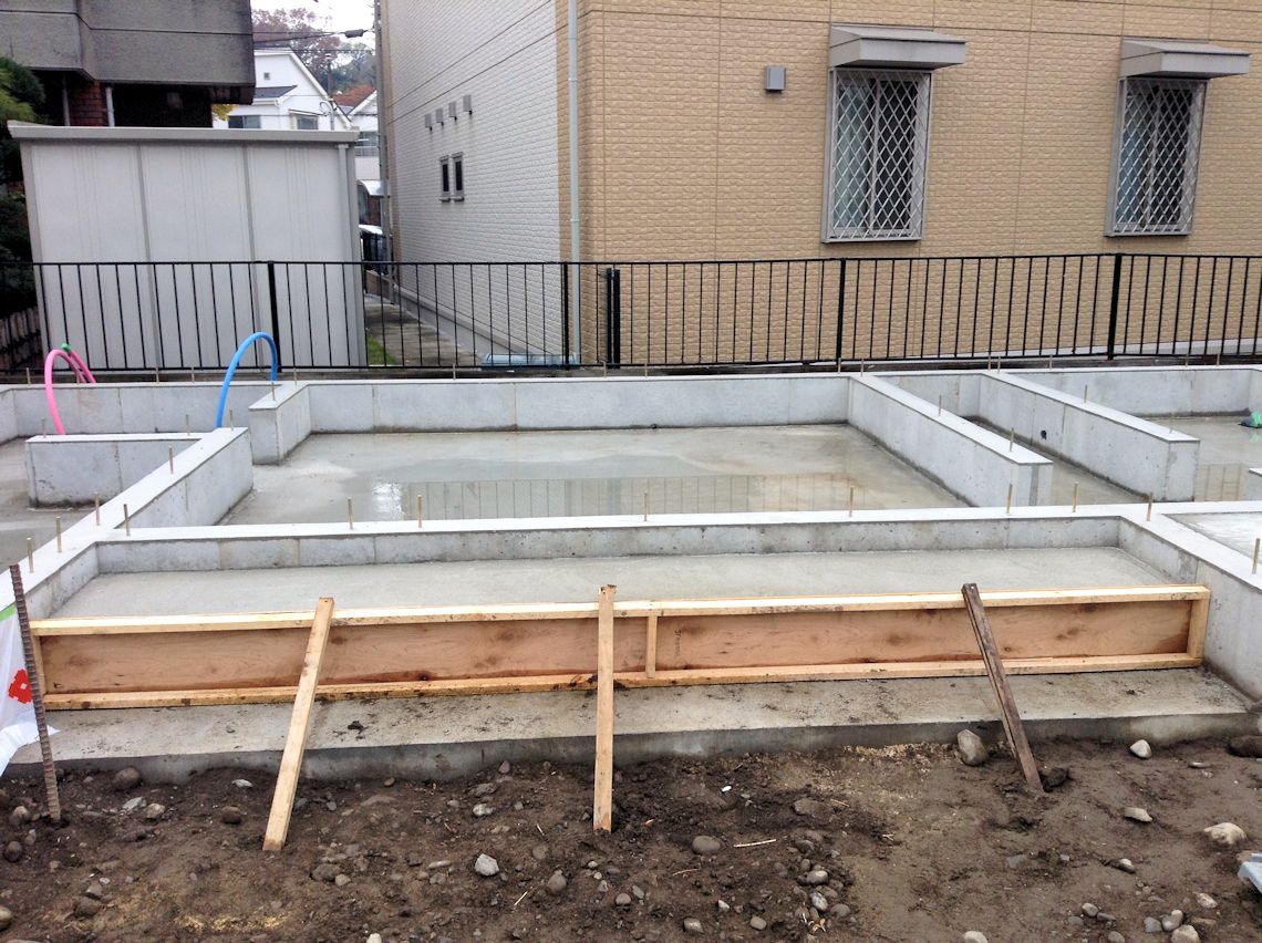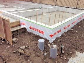 | 壁の下になる部分の基礎ができました。玄関前の柱の基礎もできています。浴室になる部分だけ何やら貼ってあるようです。 | ||