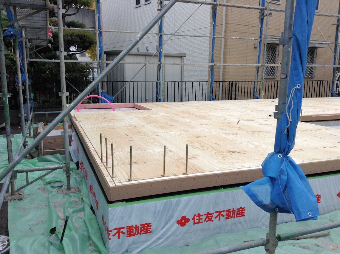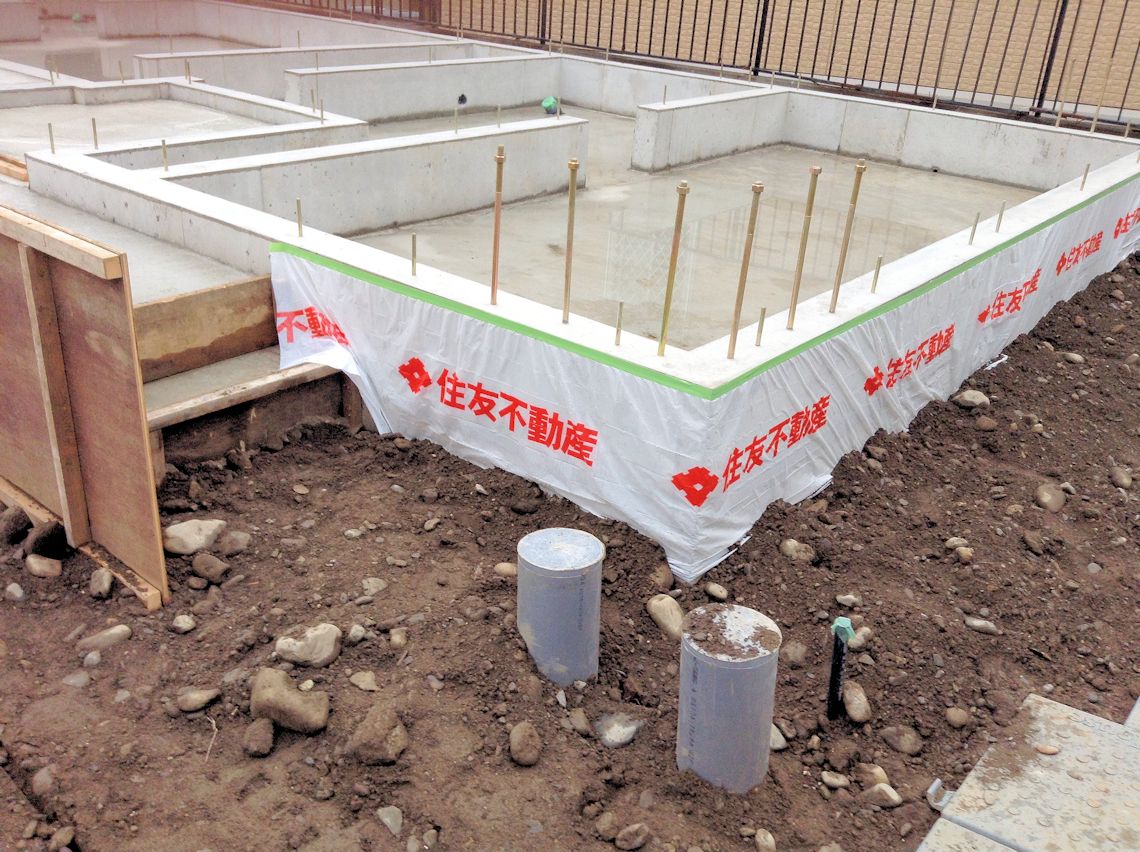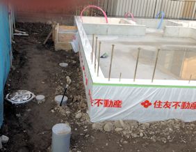 | 捨てコンクリートを打って防湿シートを張った状態です。防湿シートの下にはシロアリ防止の薬品が散布されているそうです。 防湿シート自身も防虫効果があるそうです。 |