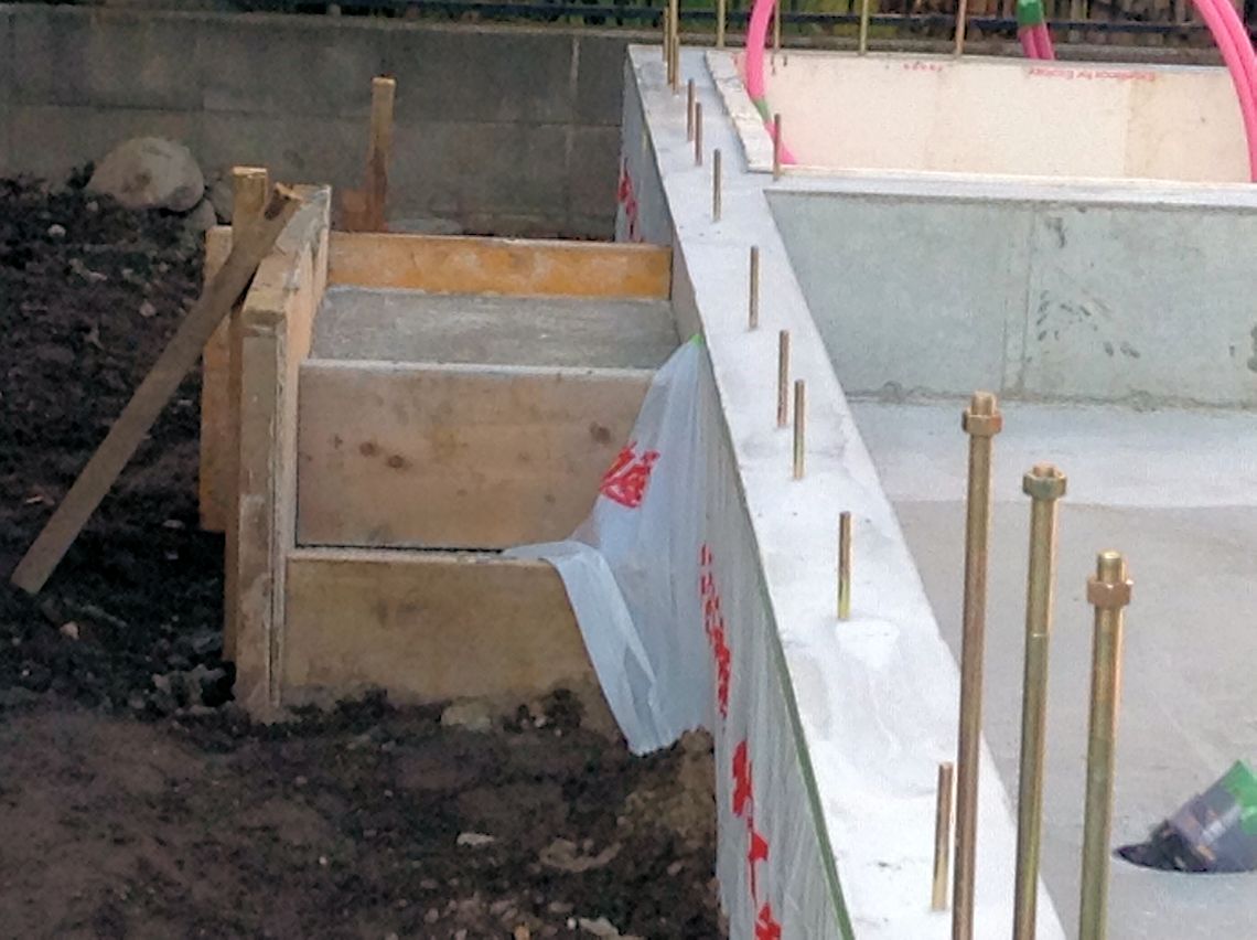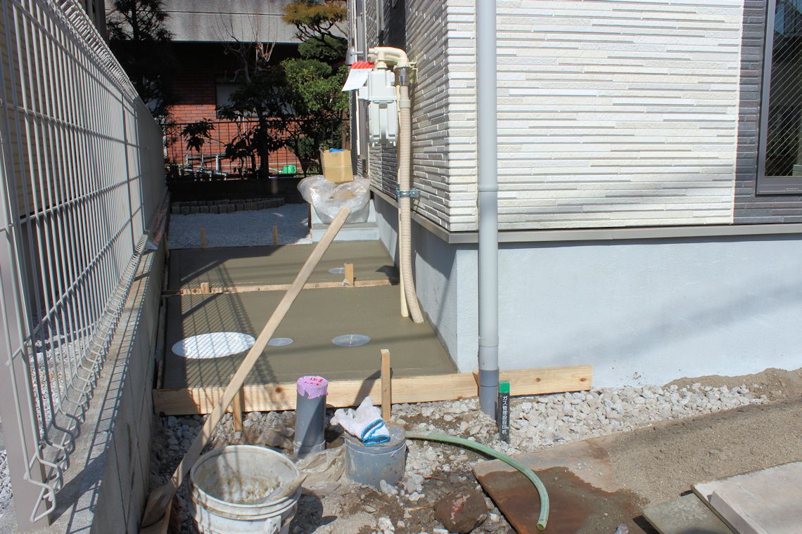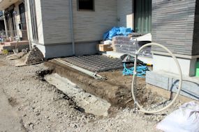 | テラス前(左の写真)と玄関ポーチの階段部分(狭いですね〜)ができました。玄関と玄関左横の倉庫部分にはコンクリートが流し込まれています。 | ||