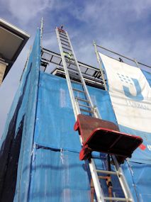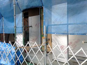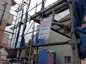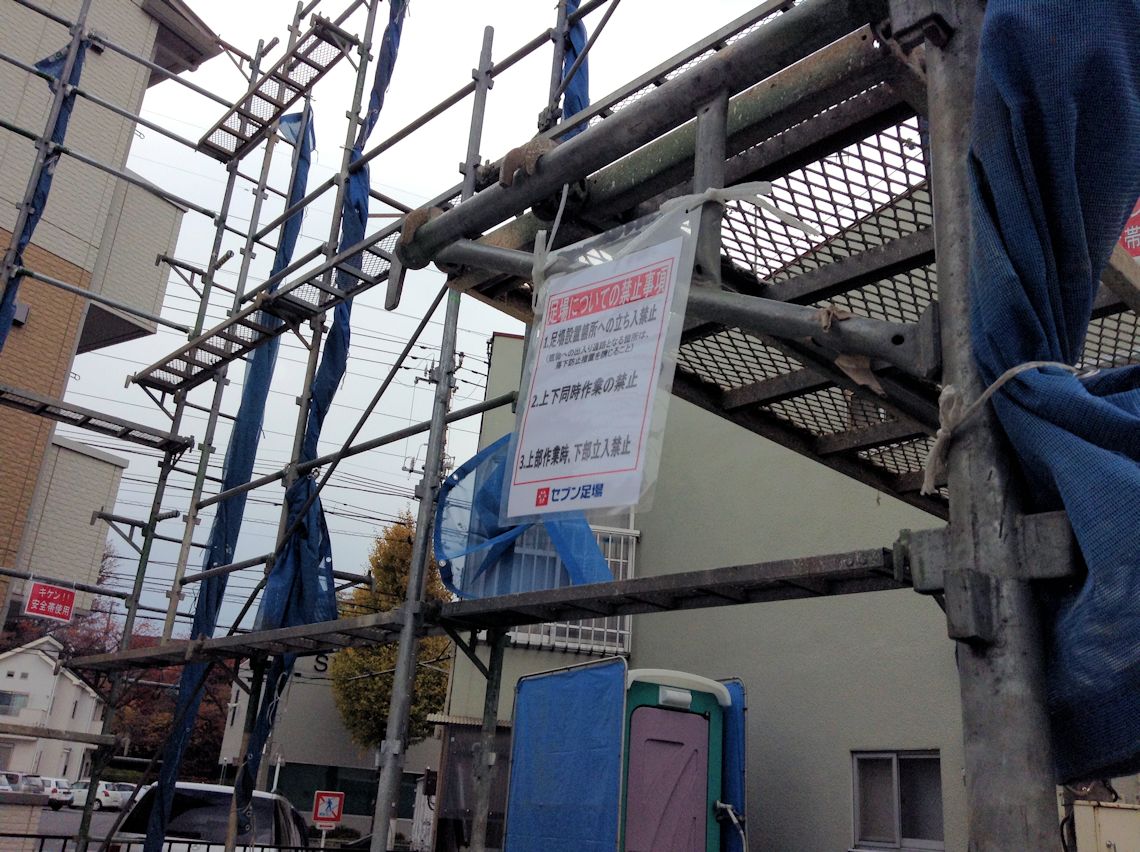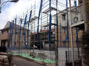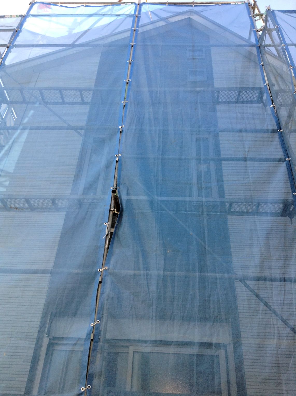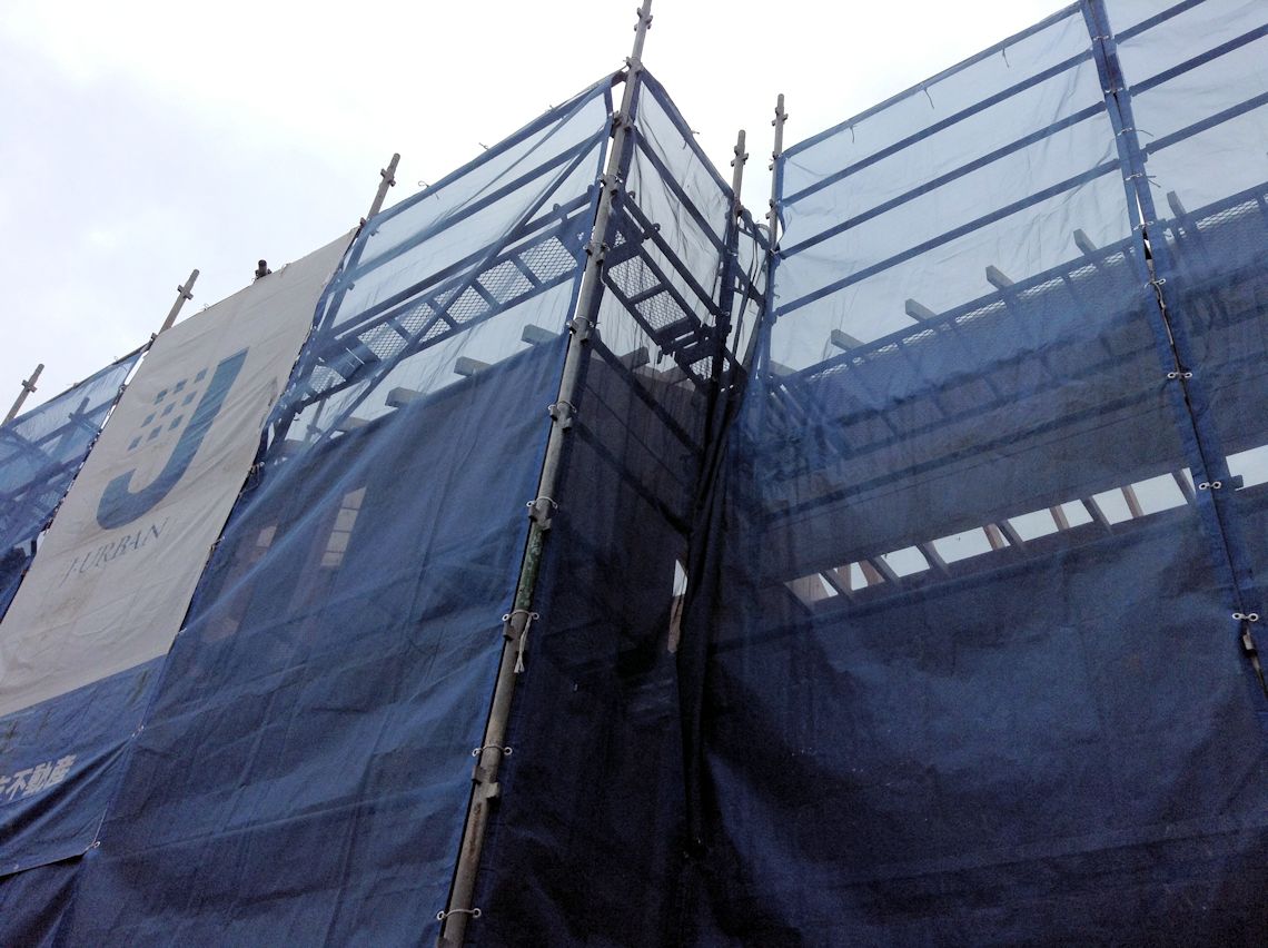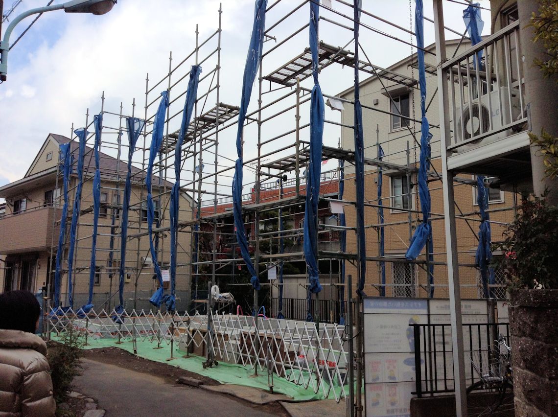 | やっと足場が架かりましたが、この状態になってすでに5日目です。雨が多いせいか、なかなか進捗しないな〜 | ||