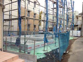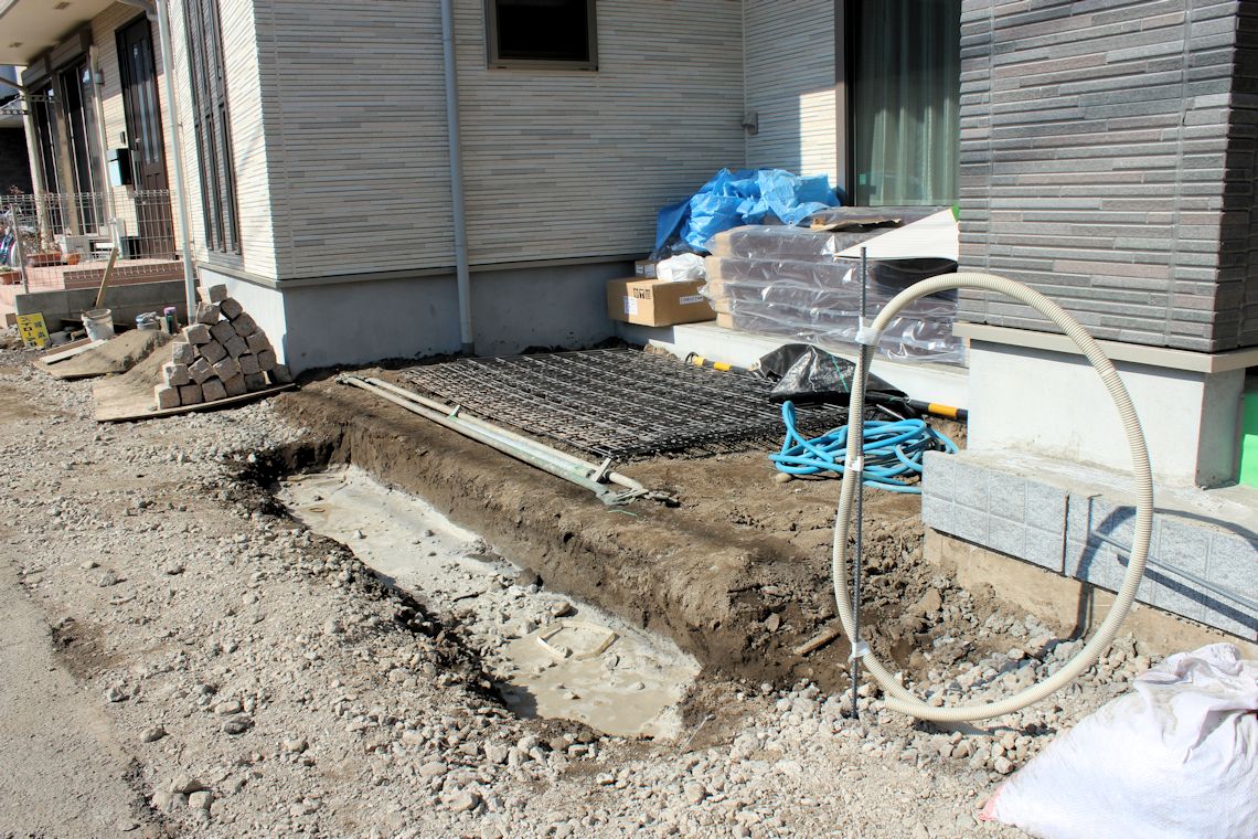 | 外構工事が始まりました。駐車場部分です。 | アルミポールと機能門柱部分の基礎です。 | 西側部分です。 |