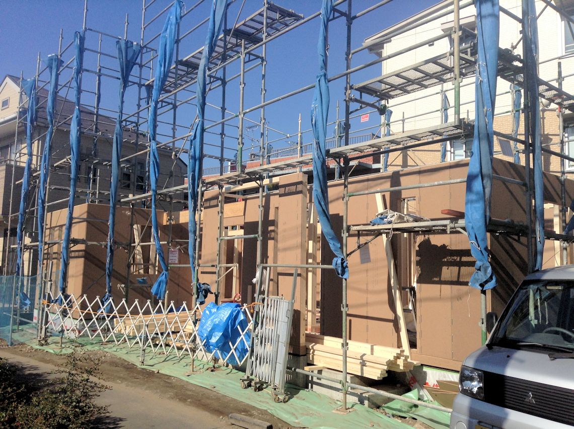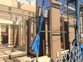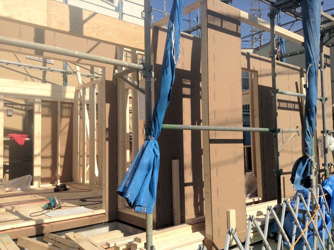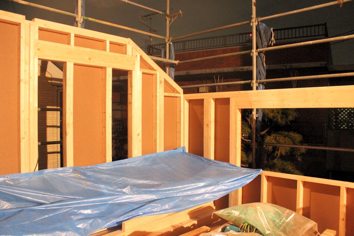 | 周囲にシートが張られたので状況が分かりづらいですが・・・屋根裏部屋まで壁ができました。屋根を取り付ける木材も取り付けられていました。 写真右側に屋根裏部屋が作られていますが、こちら側は、第1種住居地域となっているため写真左側より少し屋根が高くなっています。 |