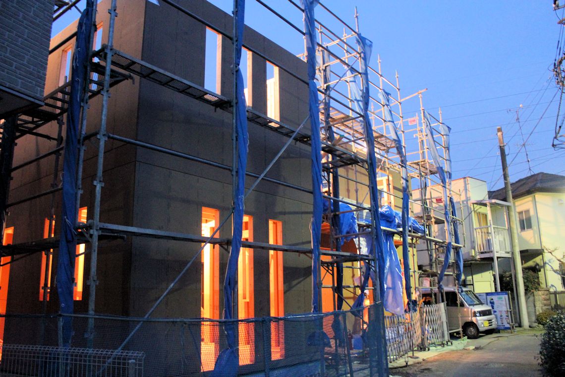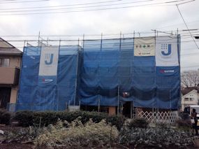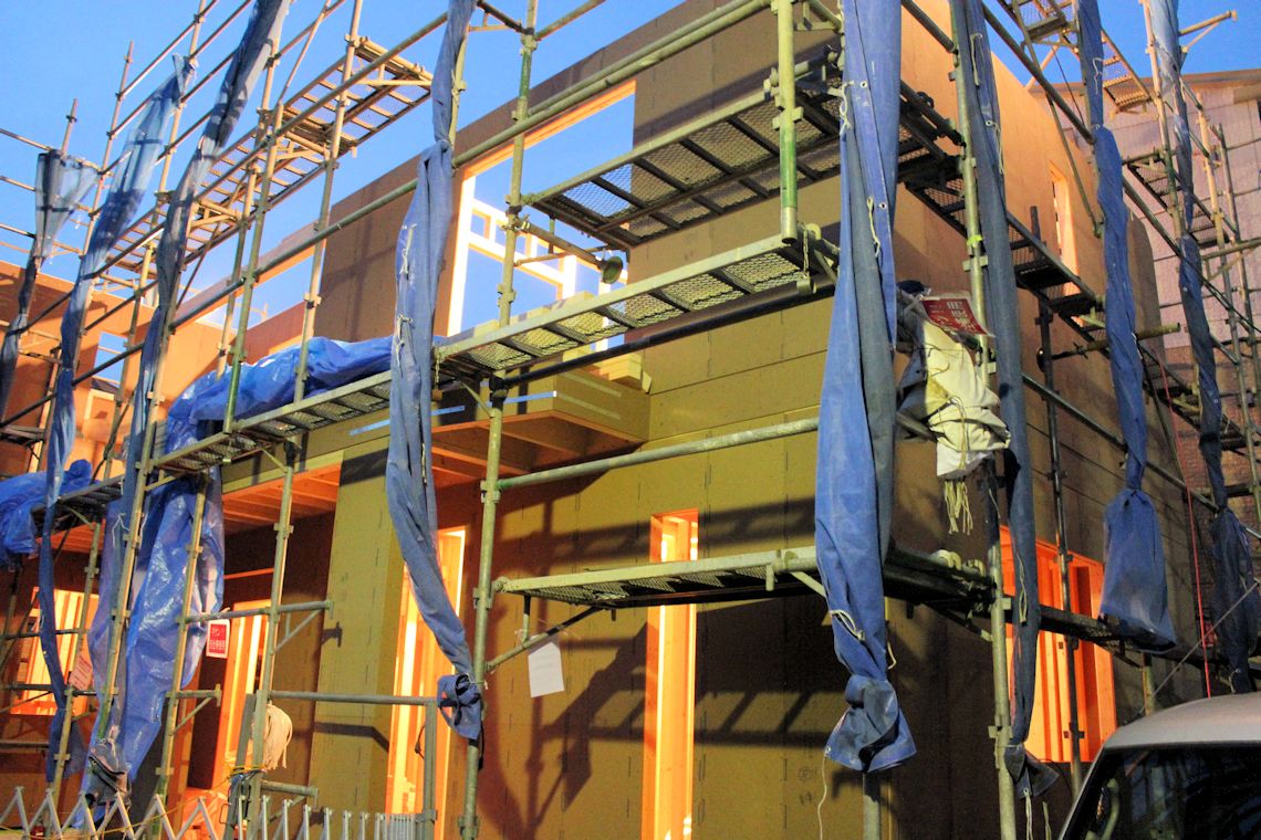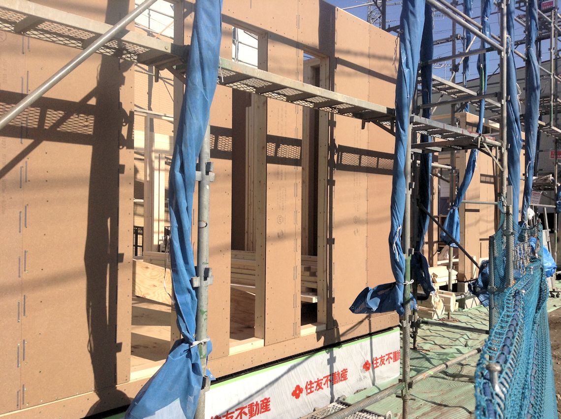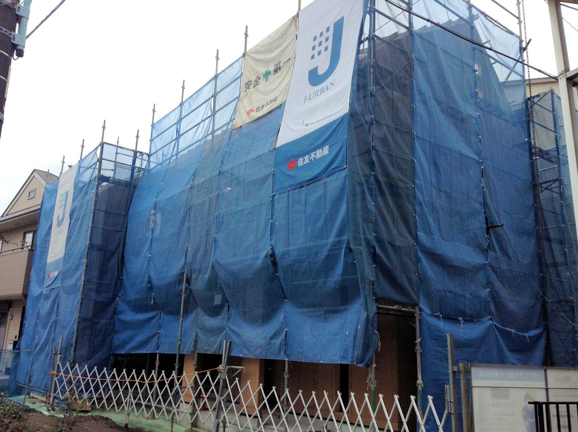 | 周囲にシートが張られたので状況が分かりづらいですが・・・屋根裏部屋まで壁ができました。屋根を取り付ける木材も取り付けられていました。 写真右側に屋根裏部屋が作られていますが、こちら側は、第1種住居地域となっているため写真左側より少し屋根が高くなっています。 |