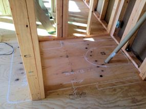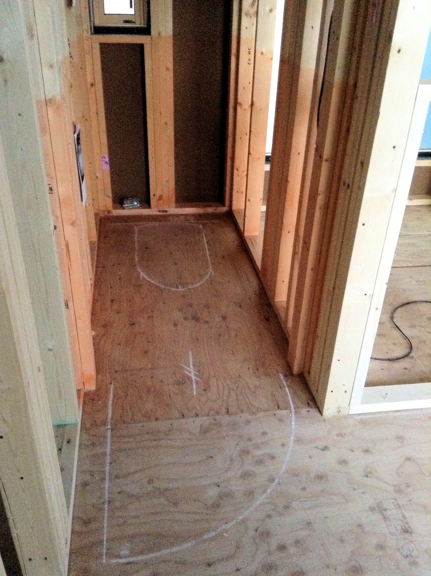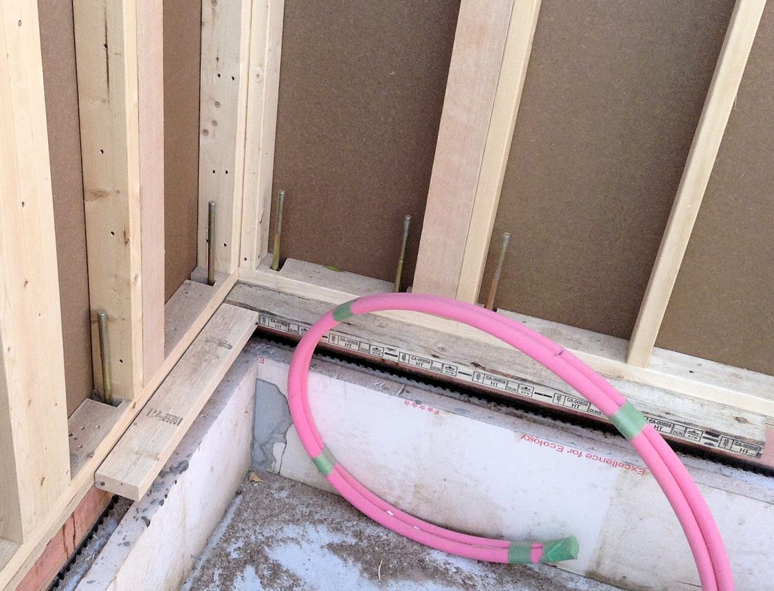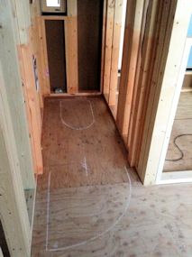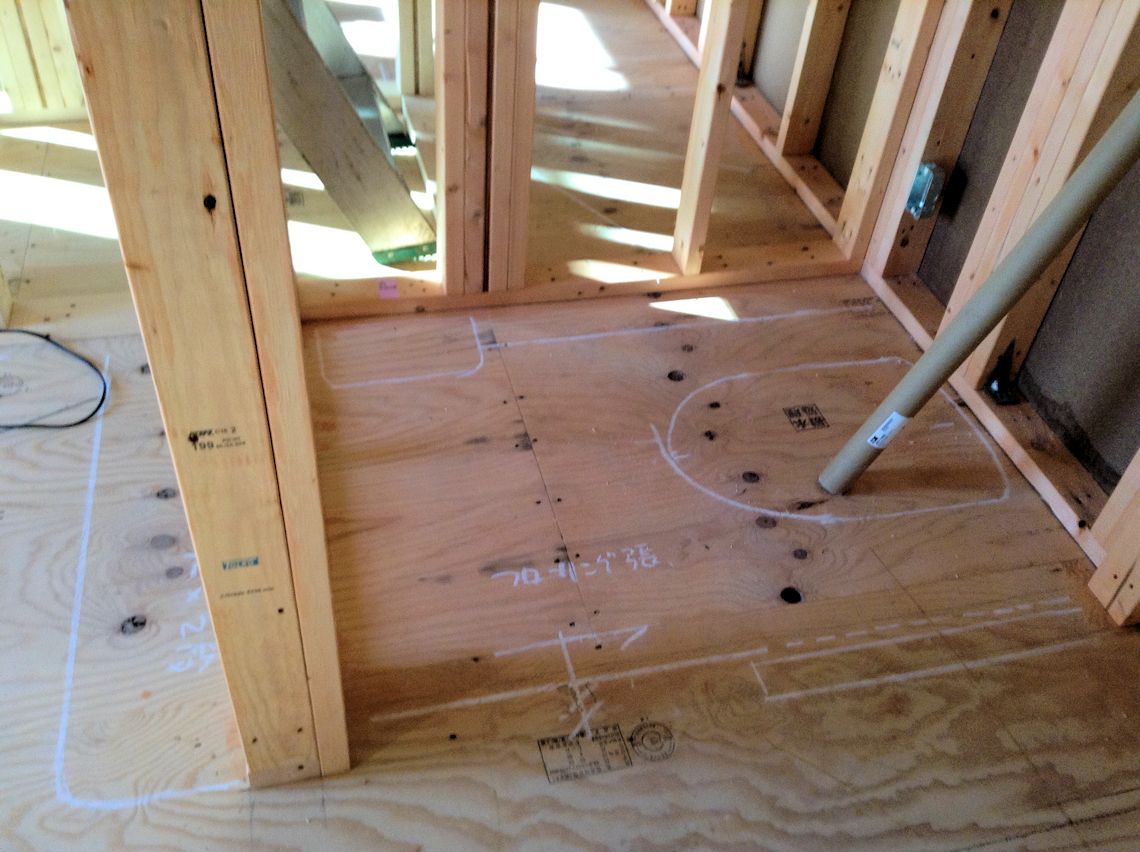 | 水道関連の配管がされたようです。キッチンの出入り口の階段もできました。 | ||