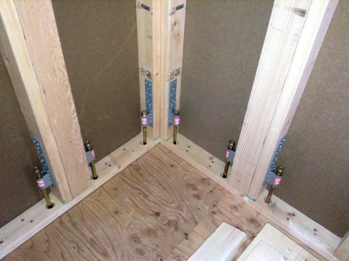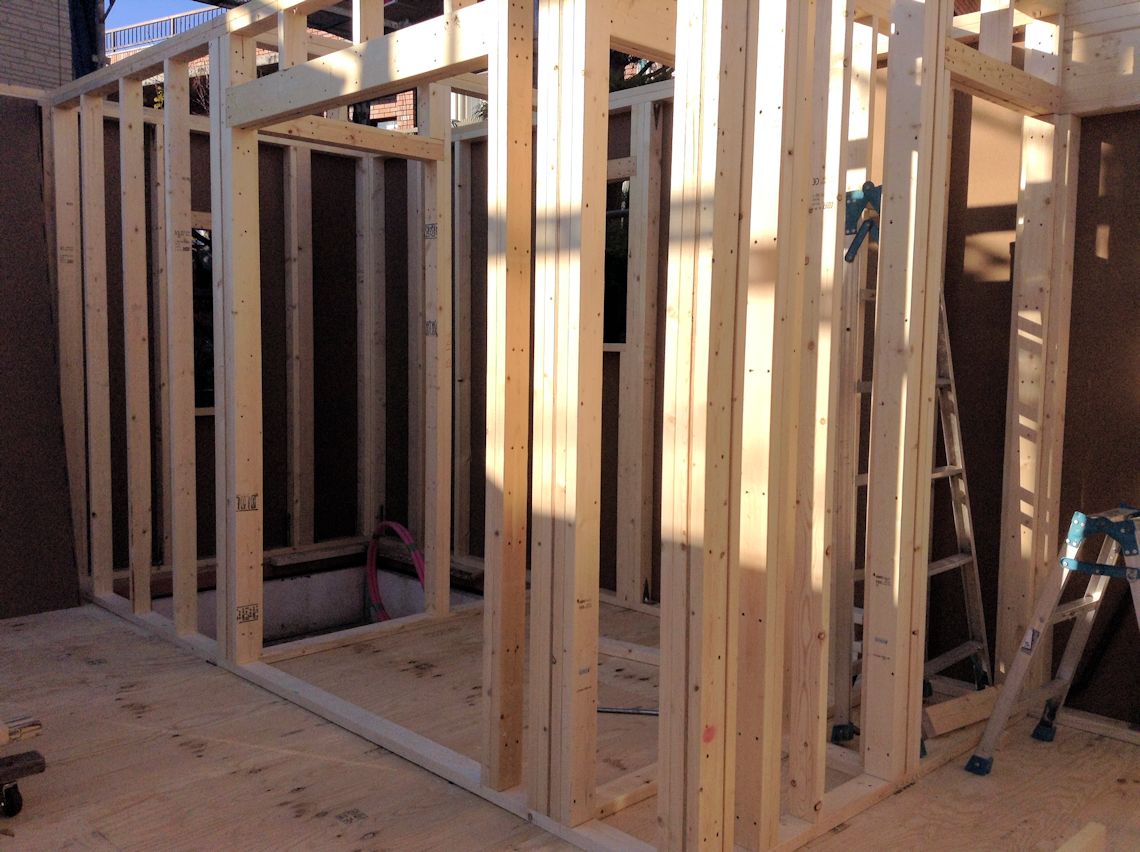 | やっと壁が立ち始めました。2x4とは言え、かなり大工さんの手が入るのですね。 まだ、New Power Column が取付されていませんので、取付用のボルトが家の角の壁の内部に見えます。 |