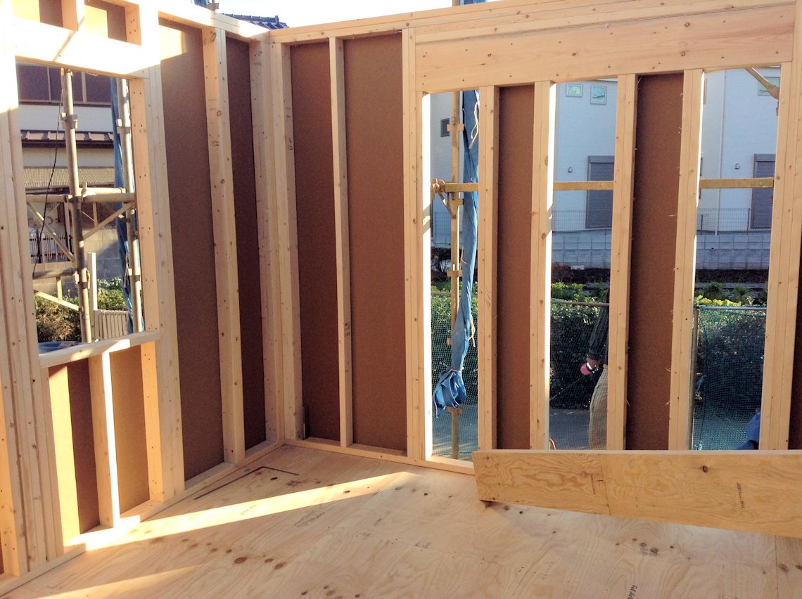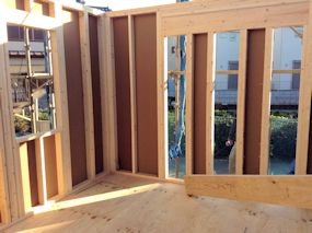 | 2階の床部分ができて、2階の壁ができはじめました。バルコニーの端は、ちょっと斜めにしてみました。 木材は全部同じ厚みで、用途に応じて組み合わせて使用しています。第1種低層住居専用地域のため、2階は勾配天井にすることにしました。 |