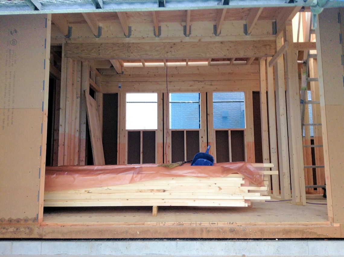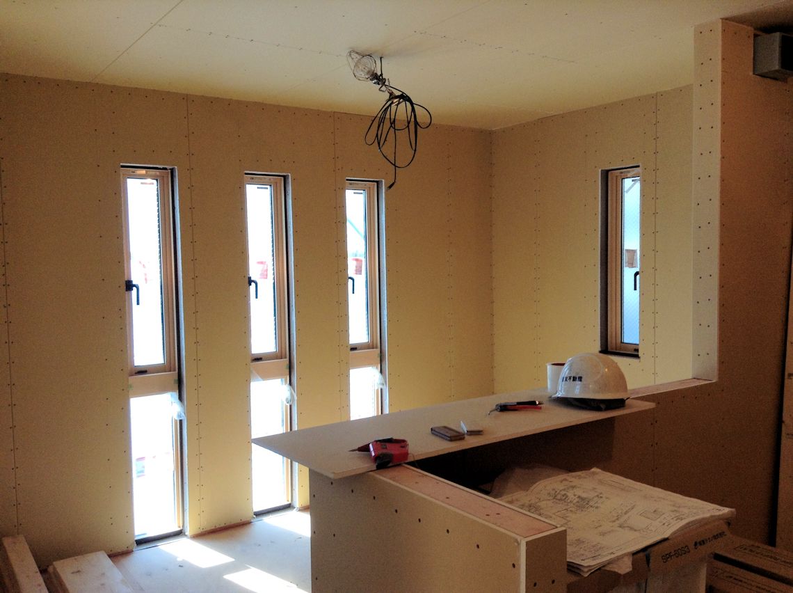 1階のリビング部分も石膏ボードが施工されました。 壁ができると、室内の感じがつかめてきます。 |