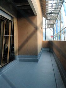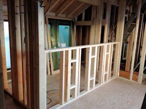 | 2階のホールです。今は落下防止の板がひかれてい ますが、完成時は窓側は吹き抜けになります。 |