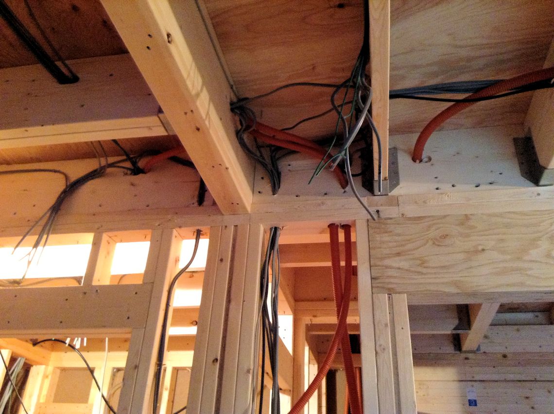 | 1階のリビングとキッチンの間です。 梁の中に配線が見えます |