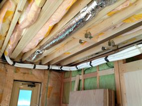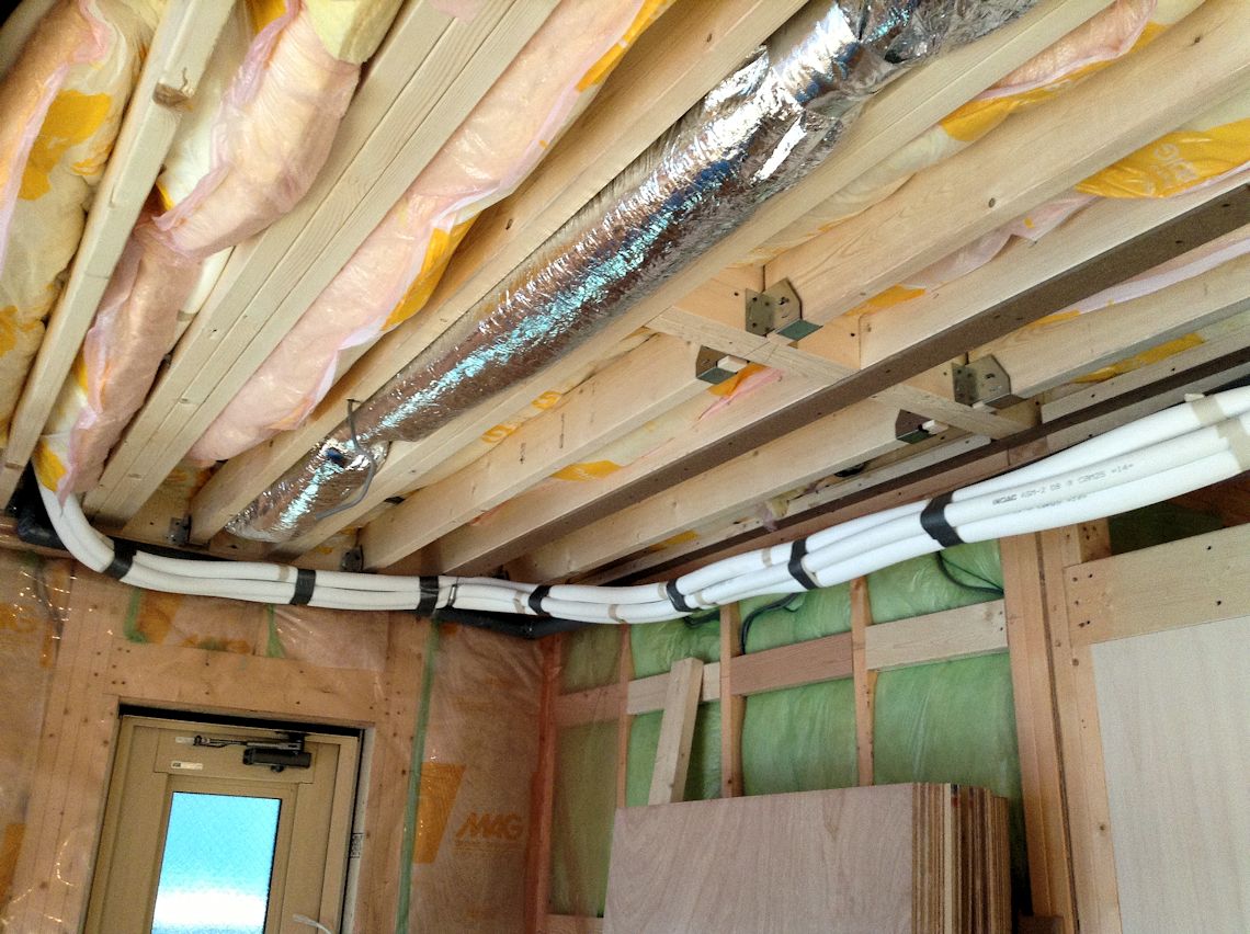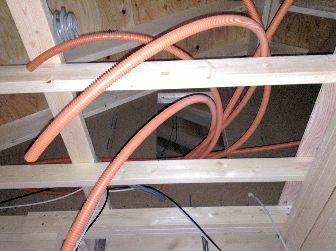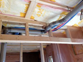 1階の玄関の天井です。2階の洗面からの排水管と 電気と同軸の配線が見えます。さらに空調用の配管 もされることになります。 |
