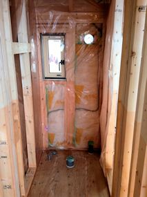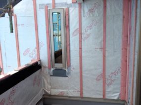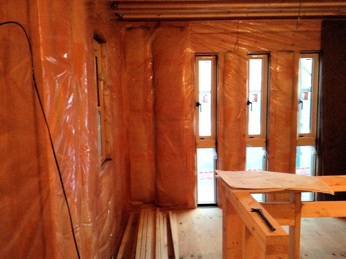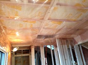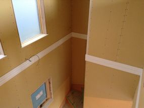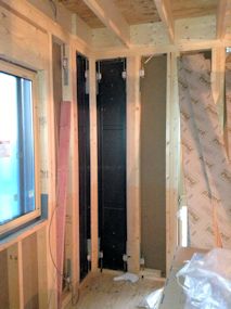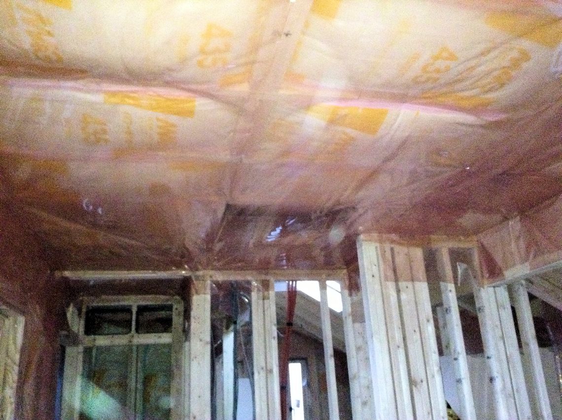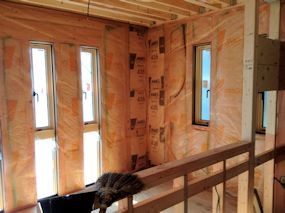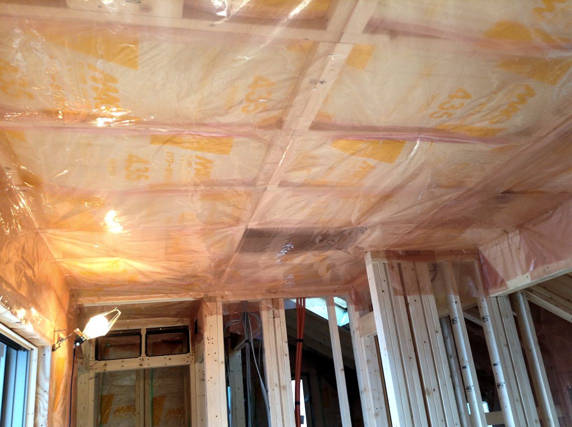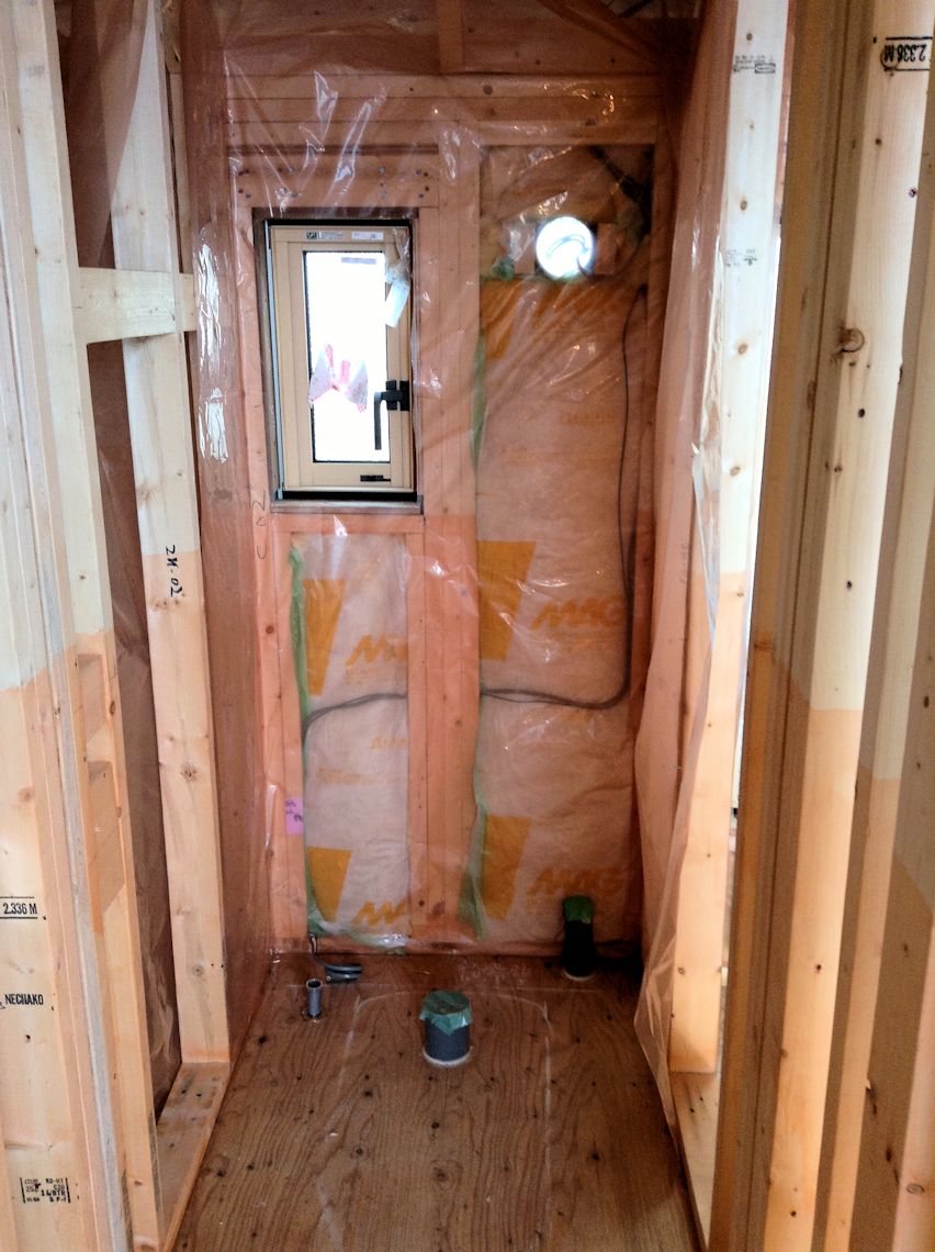 | 断熱材と石膏ボードの間に使用される防湿シートが 1階の壁部分に貼られています。 |