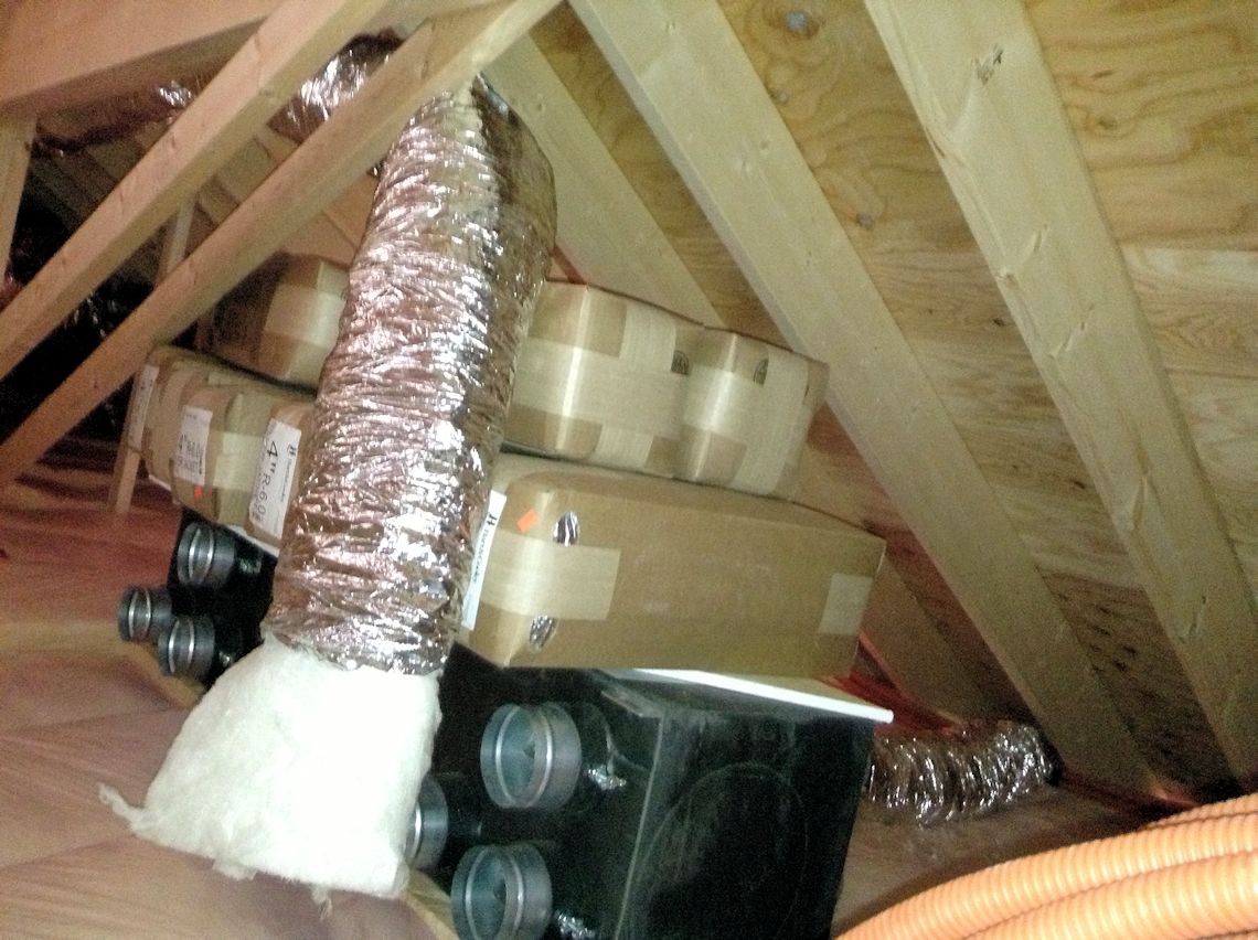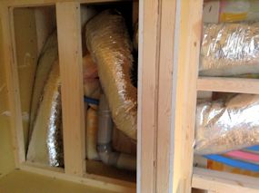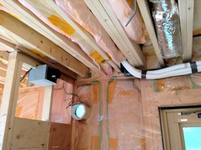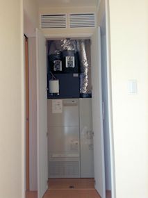 | 全館空調用の機材が天井裏に搬入されていました。 | キッチンの天井部分です。左に見える箱のようなもの は、リビングへの空調の吹出グリルです。 |