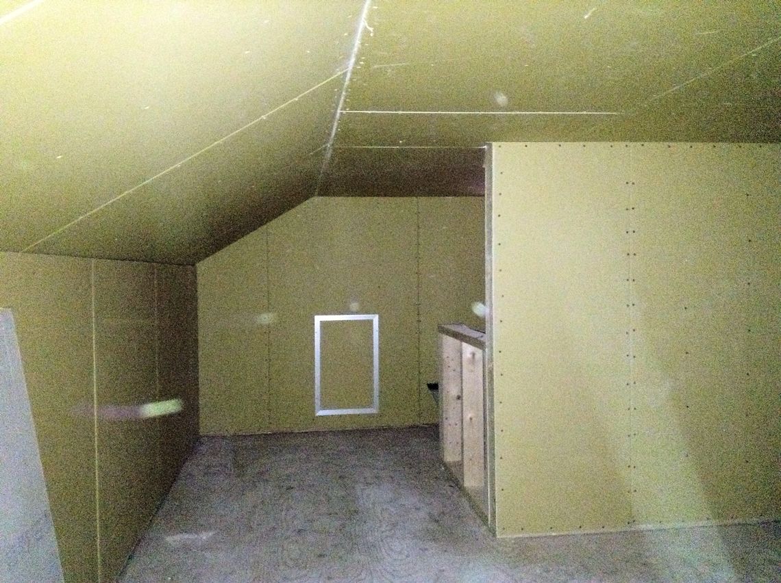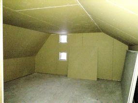 | 屋根裏部屋の壁と天井にボードが施工されていま す。(部屋奥から階段側を撮影) |