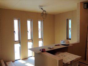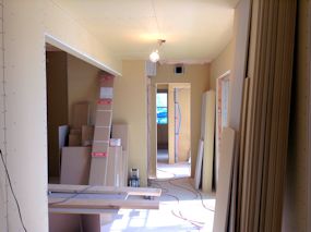 | 屋内の壁に石膏ボードが施工されました。 写真は、キッチンとダイニングの部分です。 |