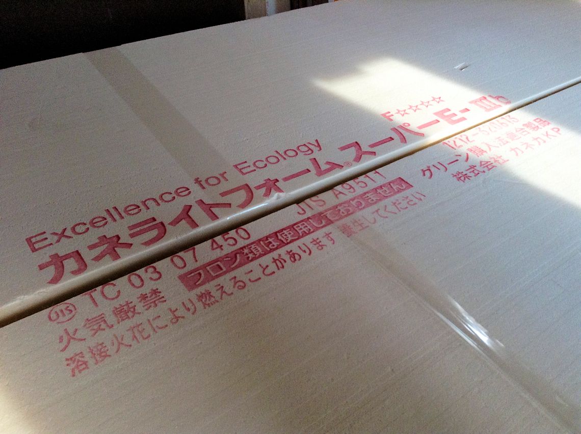 2階の傾斜天井に施工される断熱用部材です。 カネライトフォームスーパーE−Vとプリントがあります。 |