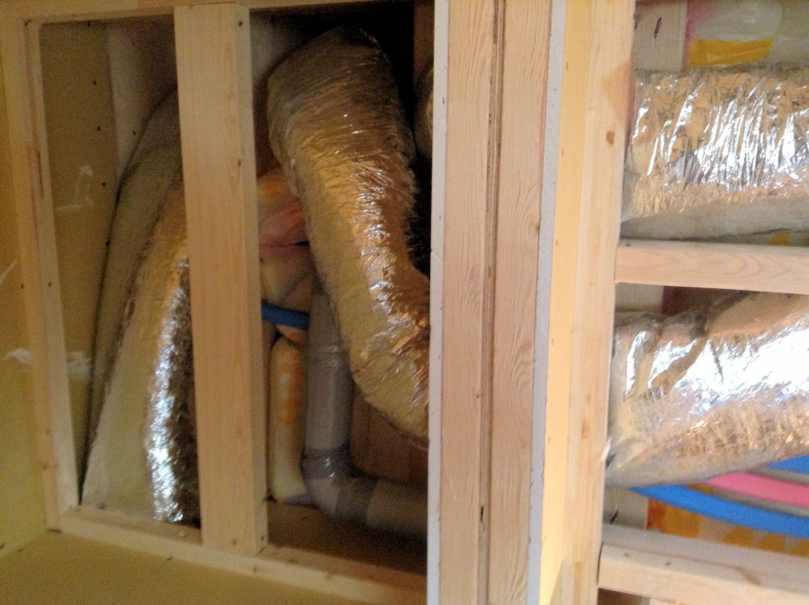 | 玄関の天井は配管のため低くなってしまいます。 | 左の天井部分を下から見ると、こんな感じで配管が されています。 |