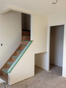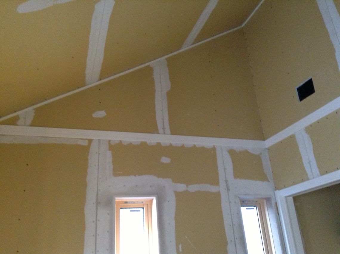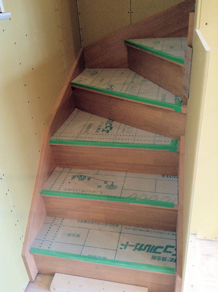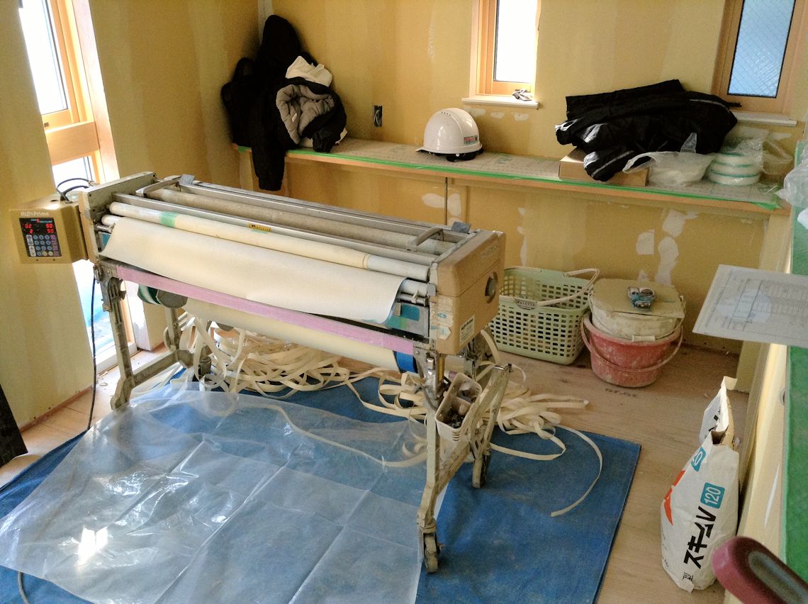 | 2階は壁紙を貼るための準備が始まりました。 石膏ボードの継ぎ目などの凹みが埋められています |