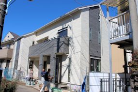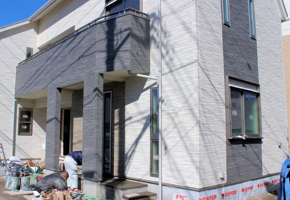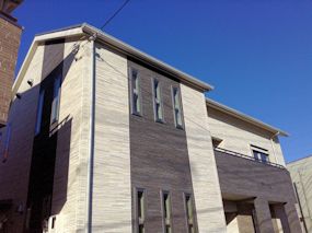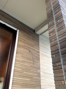 | サイデキングが貼られました。東側の外壁部分です。 | 同じ素材のものを3色使っています。 | ベースは薄い色にして、広い壁のアクセントが濃い めの色、玄関回りは、その中間色です。 |