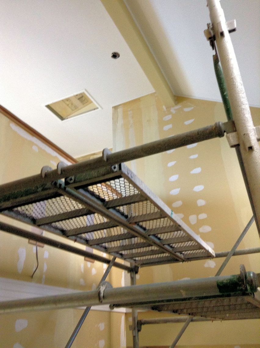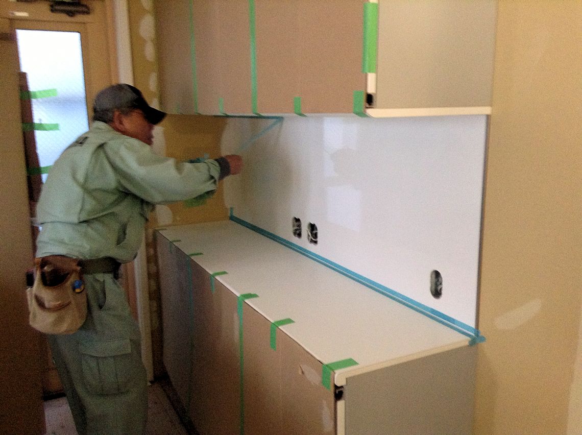 | 吹き抜けの壁紙を貼るための足場です。 | キッチンの棚の間は、レンジ前と同じ素材にしました | 見にくいですが、シャープのソーラーが載りました。 |