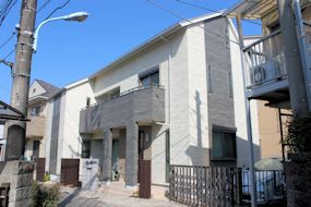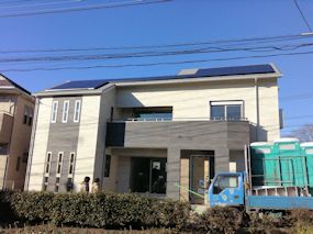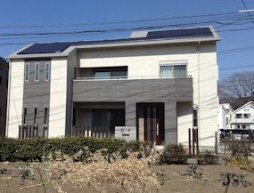 | 東側から見た図です。手前は駐車場です。 | 正面(南側)から見た図です。N型にソーラーを配置 しています。 |