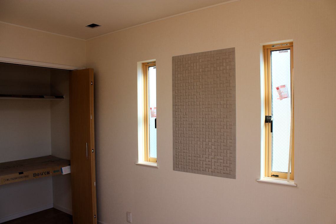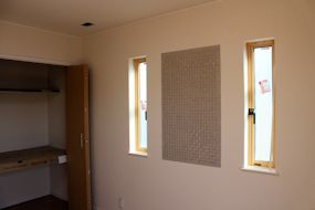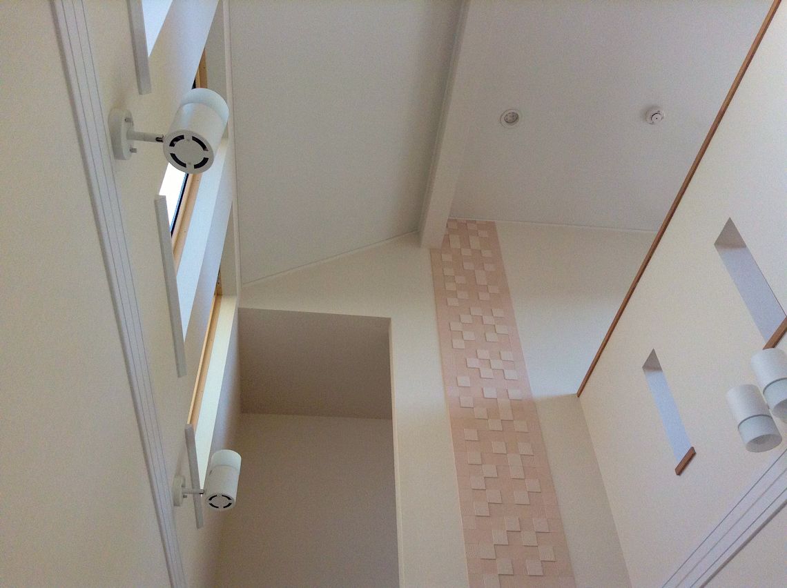 | 寝室のエコカラットは、窓の間にはりました。 | 吹き抜けのエコカラットは、高さが強調できればと 思い階段の壁全体に貼ってみました。 |