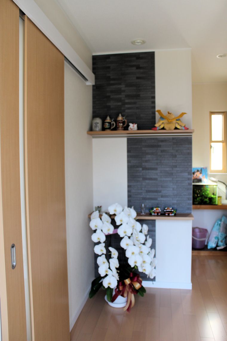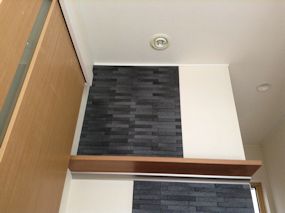 | 玄関ホールです。エコカラットでアクセントをつけて 棚を2段つけました。欄は鈴木先輩にいただきました。 |