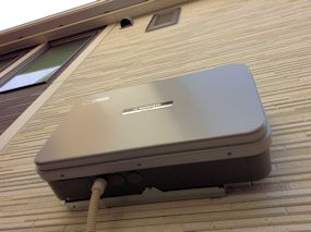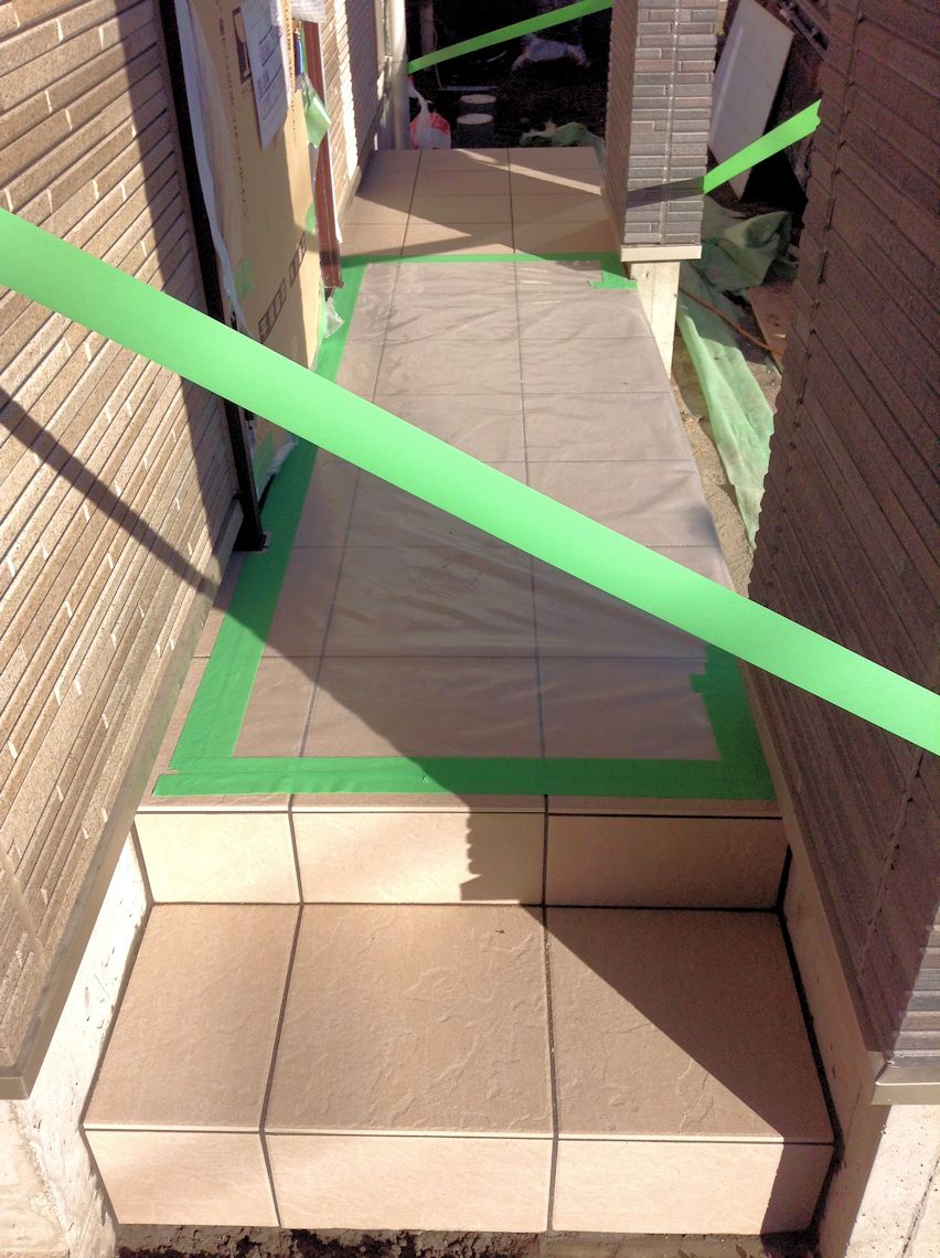 | 玄関前にもタイルが貼られました。 | シャープのソーラーのパワーコンディショナーが外壁 に取り付けられました。JH-S1C2Pです。 |