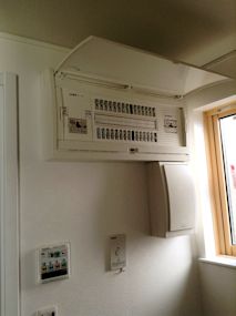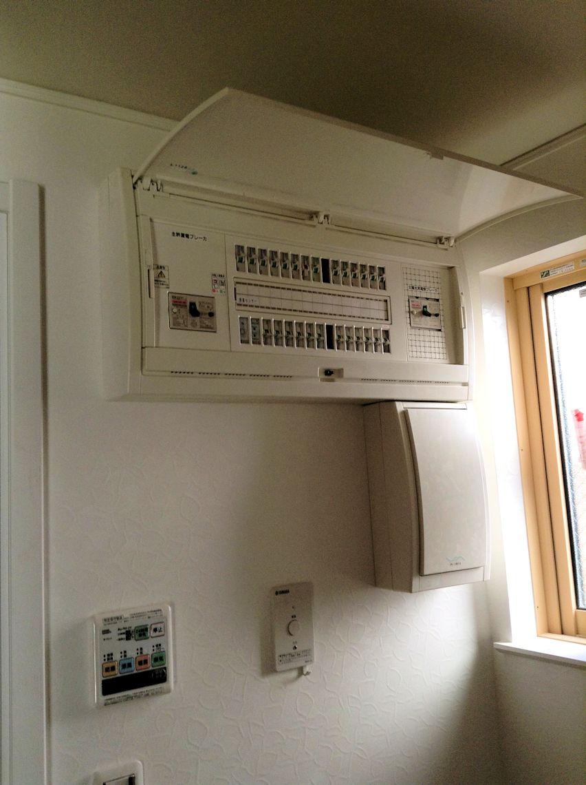 分電盤(ブレーカー)です。子ブレーカーでも20A です。東電との契約は100KVAです。 |