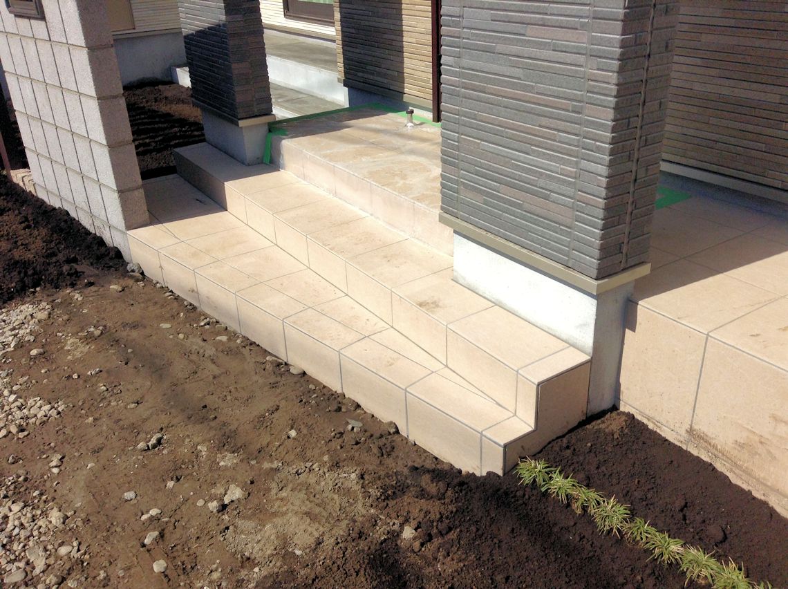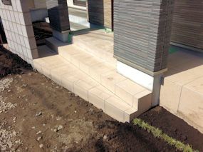 玄関前はスペースが無いので、狭めの階段になって しまいました。 |