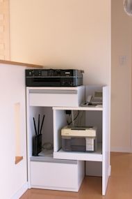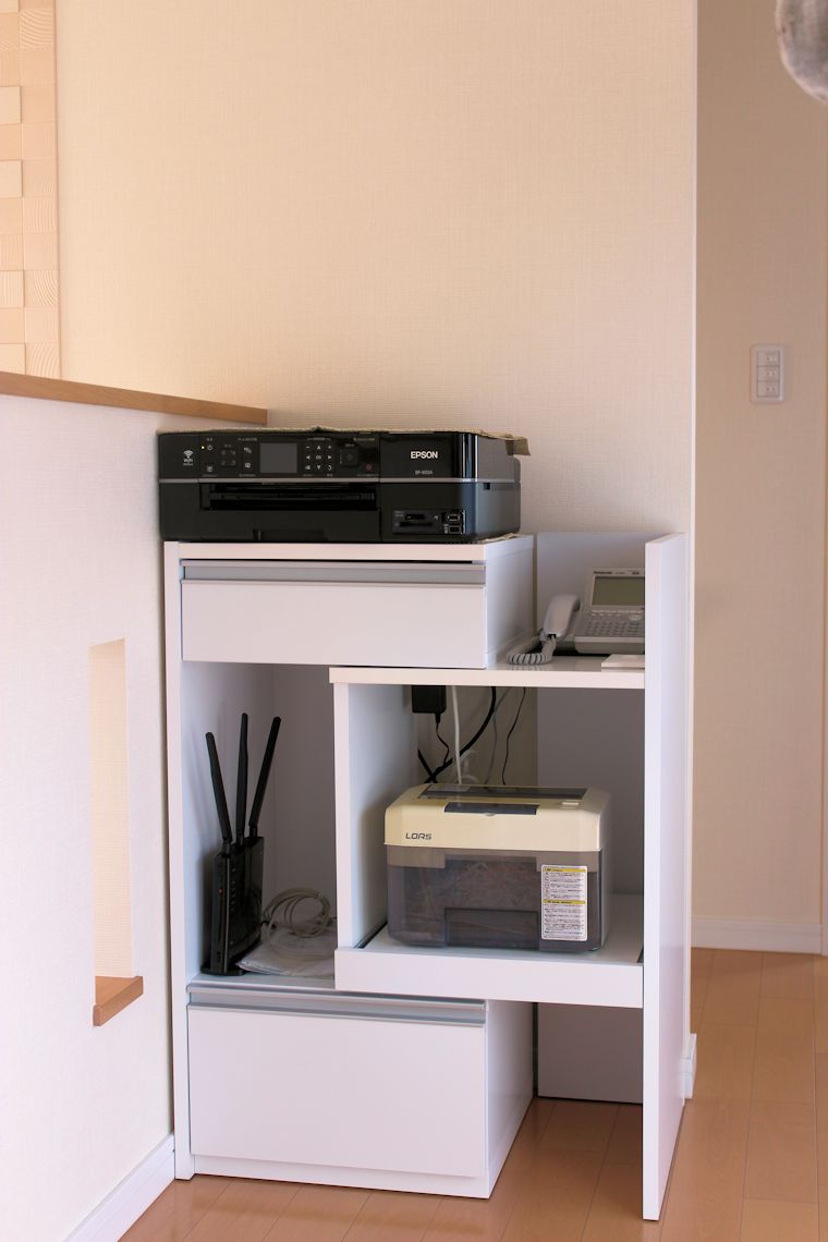 2階のホールに、共用プリンター、ルーター、電話 など、共用するものを集めました。 |